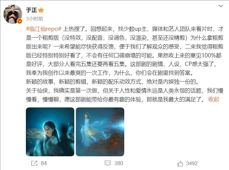 近日,电视剧《临江仙》在社交平台流露出不少观后评价,该剧的的出品公司欢娱影视负责人于正发文力挺该剧的内容,他表示播放给少量媒体的是没有特效、配音、调色的粗剪版,目的是尽快获得反馈。此外,他还分享了自己对于该版本的观后感,他表示特别好看没有任何口碑崩盘的可能性,他写道:“新颖的故事,新颖的剪辑,新颖的配乐动效方式,绝对是内娱独一份的。”表达了自己制作仙侠剧的决心。