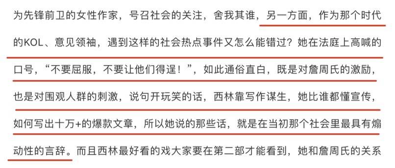 这最终导致西林的形象有些暧昧不清,她似乎是一心为詹周氏发声的先锋女性作家,似乎又是暗戳戳蹭热度的KOL。