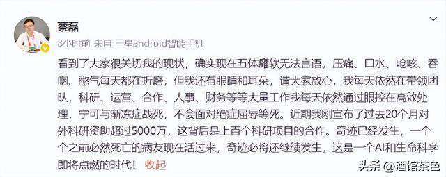 而且蔡磊发文称他们对外科研资助已经超过了5000万,他说这被收十上百个科研项目的合作,奇迹已经发生,一个之前必然死亡的病友现在活过来了。他也相信会有奇迹。