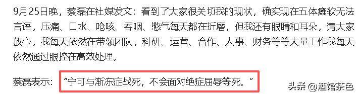但是他可不会气馁,在9月25日晚,他还发文表示,宁可与渐冻症战死,不会面对绝症屈辱而死。