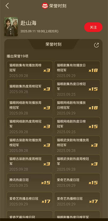 其次,“口碑与热度双重下滑”,属于典型的空口白牙不看真实数据了。口碑这东西,没有具体的可以参照的对象。但是,热度可是有的。《赴山海》从上线到点映直通大结局,各大平台的热度值都是第一。但凡这个时间段的热度到了第二,也算下滑。然而,并没有。猫眼专业版甚至于给这部电视剧开出了19项荣誉成绩,都是冠军荣誉成绩啊。这是公开可查的。
