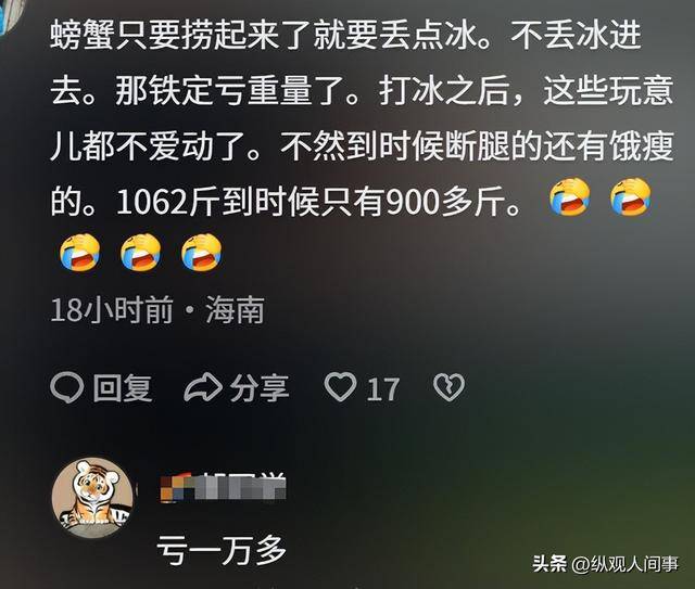 “螃蟹只要捞出来就开始损耗,看你们又是扔又是网的最后肯定断腿,再检验几天还会饿瘦,1000多斤到时候能落下900斤就不错了。”