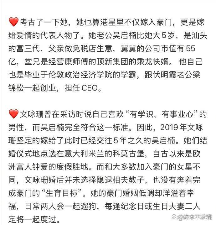 当然,文咏珊本人经济条件也非常优越,选择吴启楠更多是看中了他的性格。她曾坦言自己是个追求完美的人,不喜欢另一半过于强势。吴启楠感性且不具有大男子主义,极为符合她的择偶标准。
