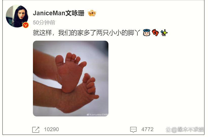 娱乐圈终于传来喜讯——37岁的文咏珊晒娃官宣当妈,她一句“我们的家多了两只小小的脚丫”,瞬间收获无数祝福。