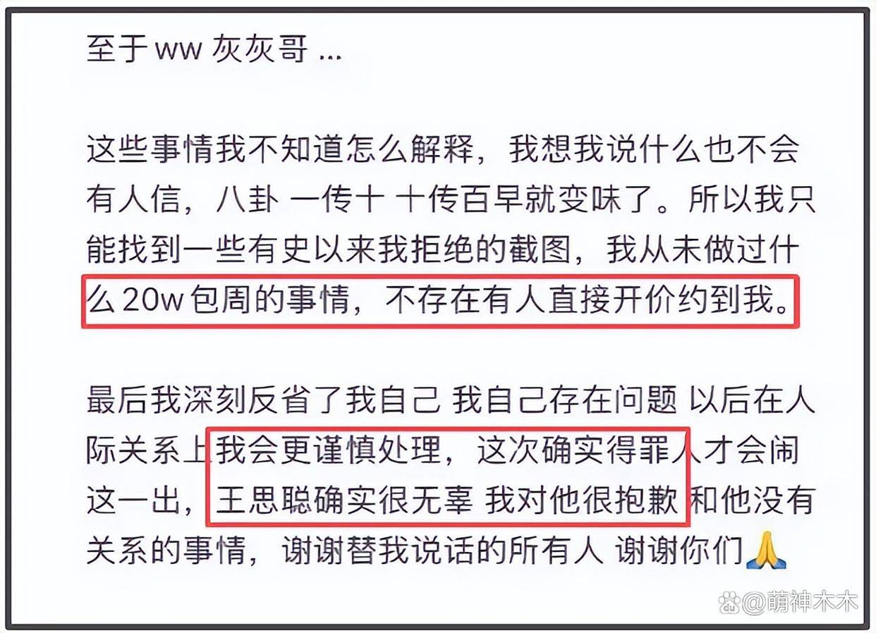 随后,王思聪发布长文解释事情的前因后果,称他和EL在社媒上互相关注多年,实际说话不过五句,且双方并无私人联系方式。然而,该网红不久前被一名涉嫌灰色产业的男子邀约赴日本参加饭局,在饭局上似乎有人吹嘘王思聪主动追求她。王思聪听闻后十分不满,并打探消息称EL是“每周包养费20万的外围女”。