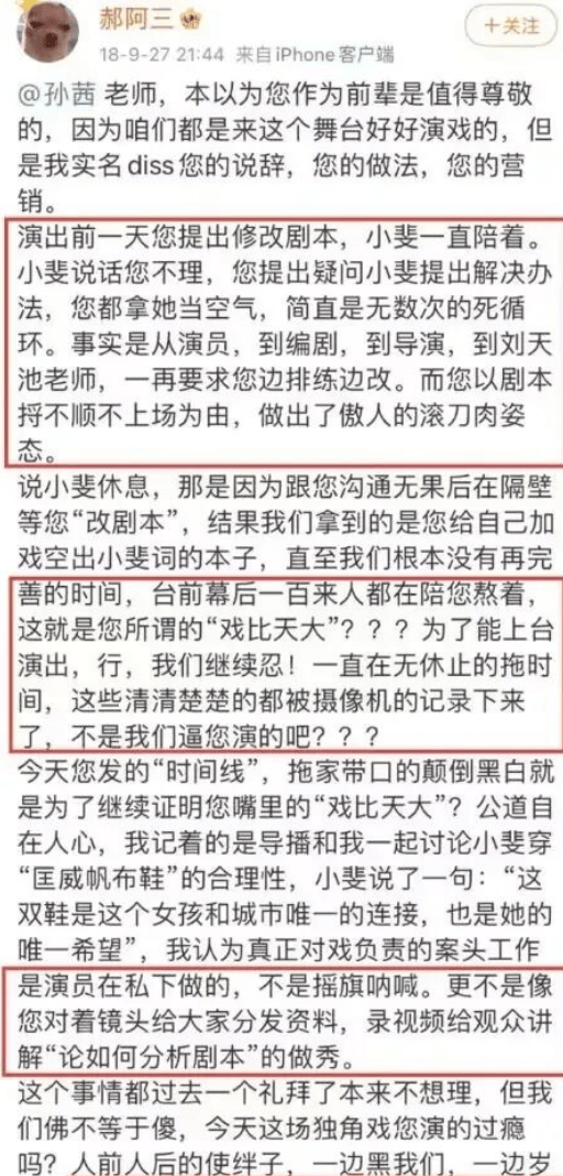 张小斐急得哭,她却冷静得近乎冷漠。更雪上加霜的是,改动后的剧本给自己加了戏,削了张小斐的台词。节目播出后,观众直接站队小斐,觉得孙茜“欺负新人”。