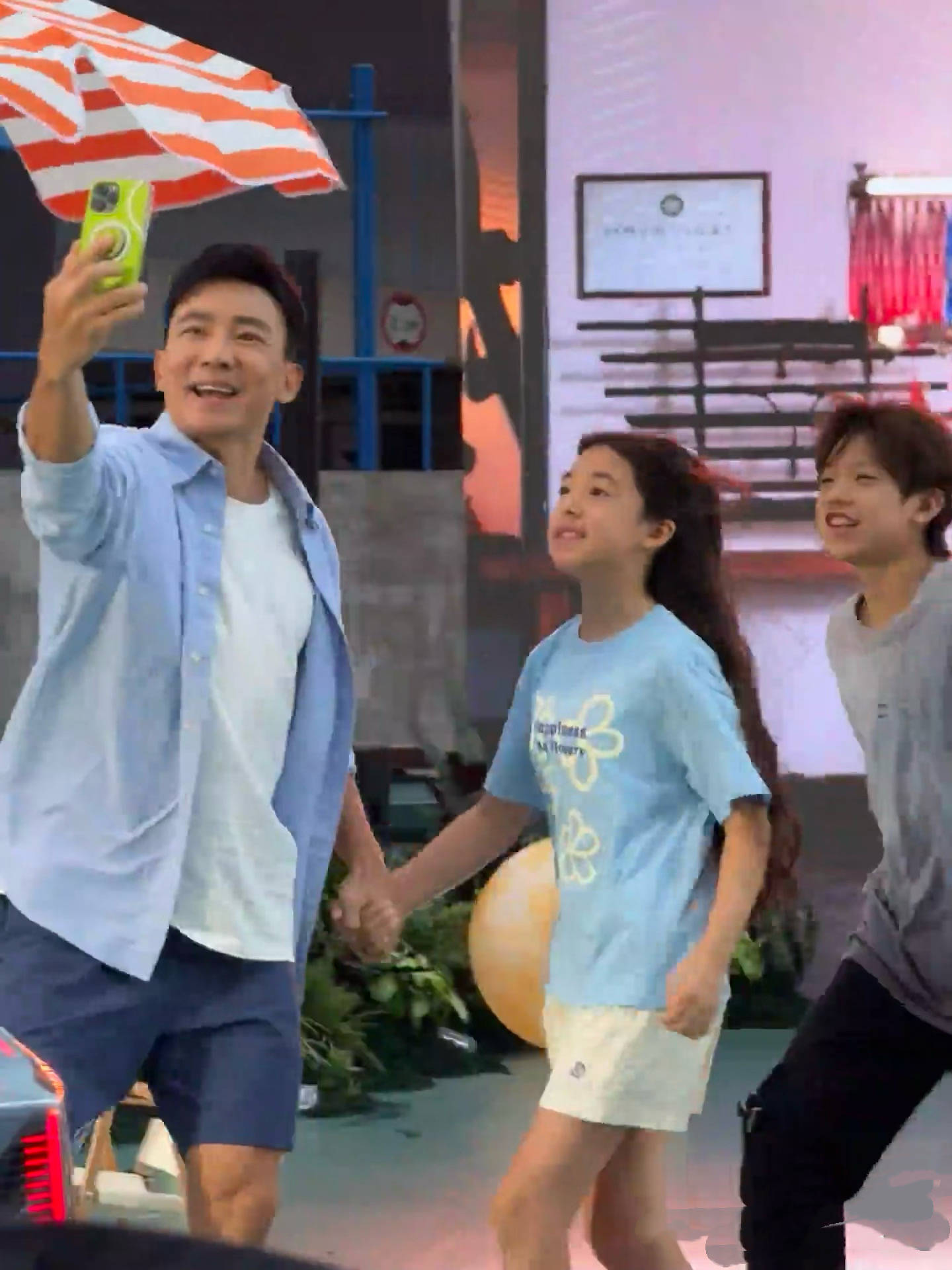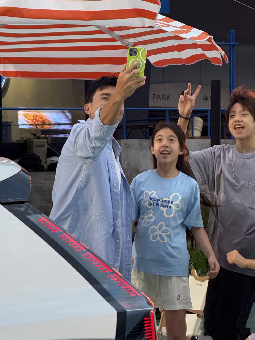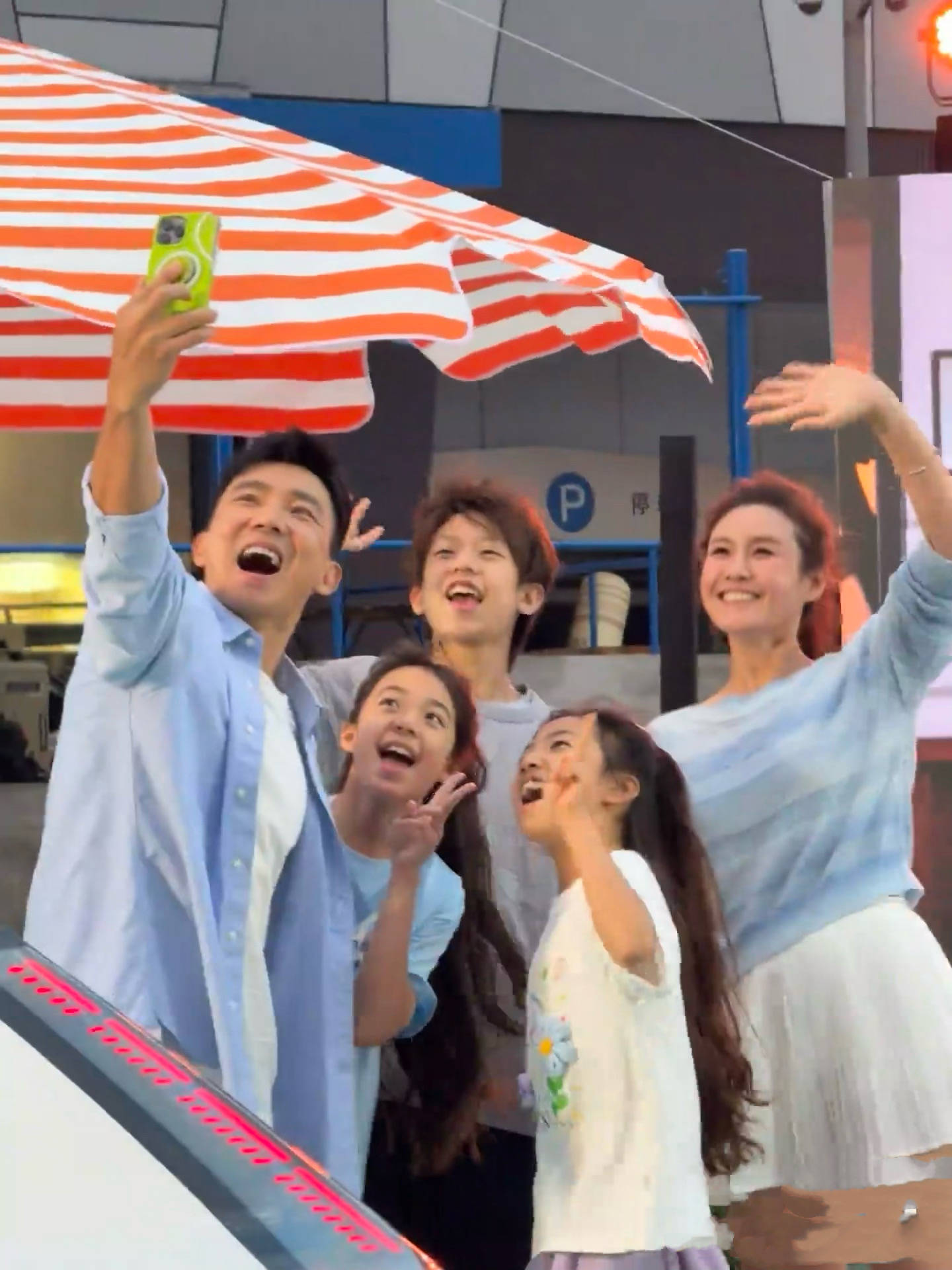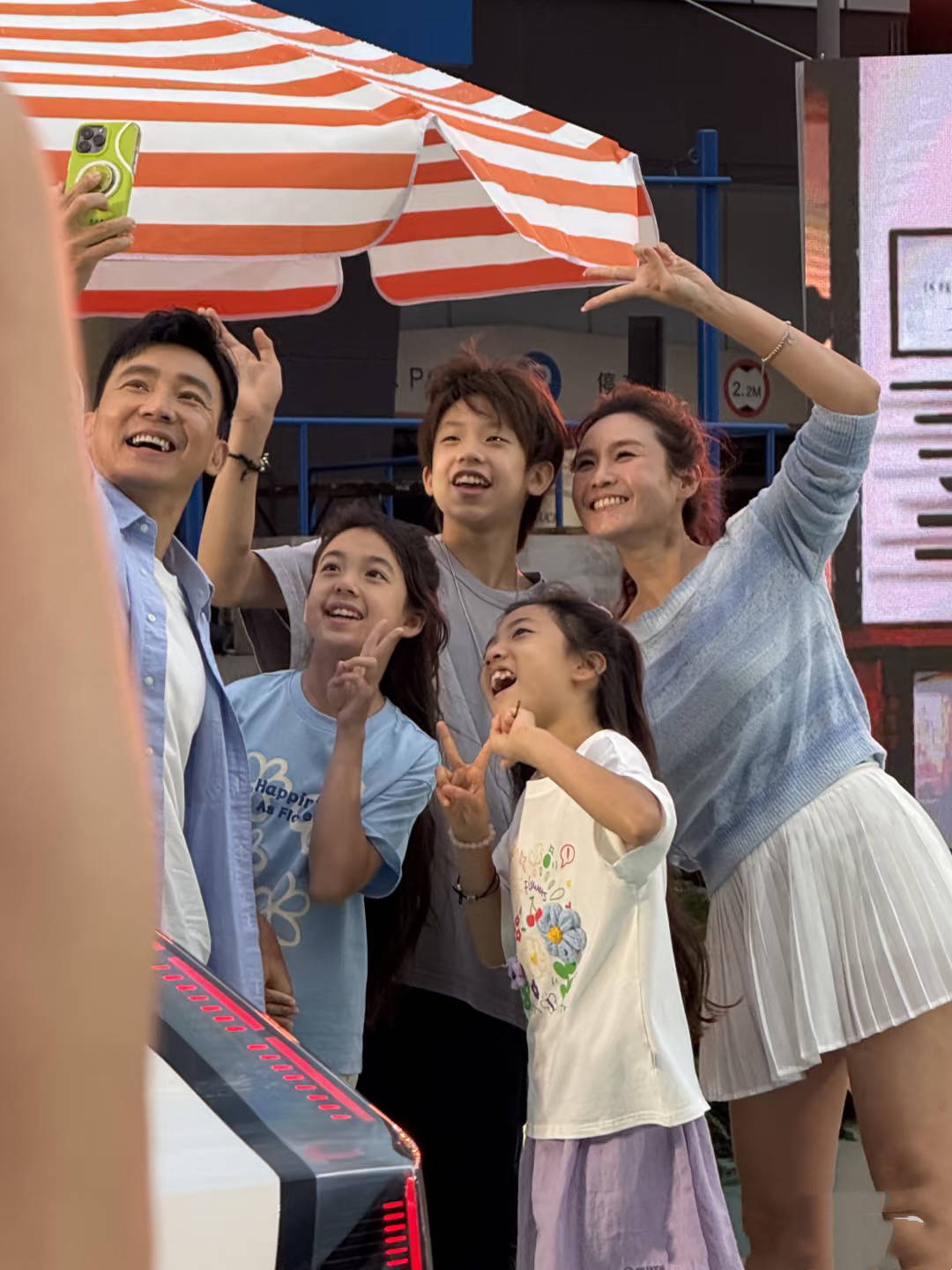 刘耕宏还拿着手机和儿子一起自拍,父子俩感情也很好。妈妈牵着俩女儿,爸爸领着大儿子,这画面好温馨。