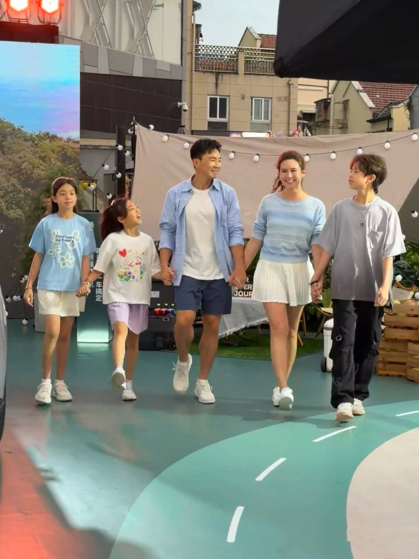 大明星一家,一出场就拉满了幸福感。刘耕宏一手牵着老婆、一手牵着小泡芙,一边是老婆儿子、一边是俩女儿,这也太幸福了。