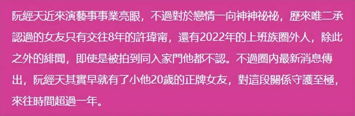 话说这次的新女友有点特别,不是圈内人、也不是网红,而是一名大学生。来自于内地、甚至比阮经天还小20岁。