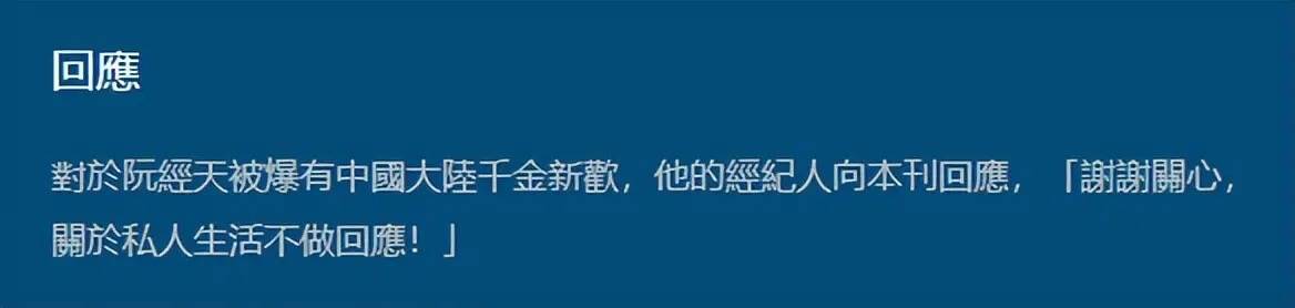 阮经天经纪人并没有否认,但也没有确认,他只说“谢谢关心,关于私人生活不作回应”。从以往的例子来看,如果是子虚乌有的造谣,经纪人一定会出来辟谣的。