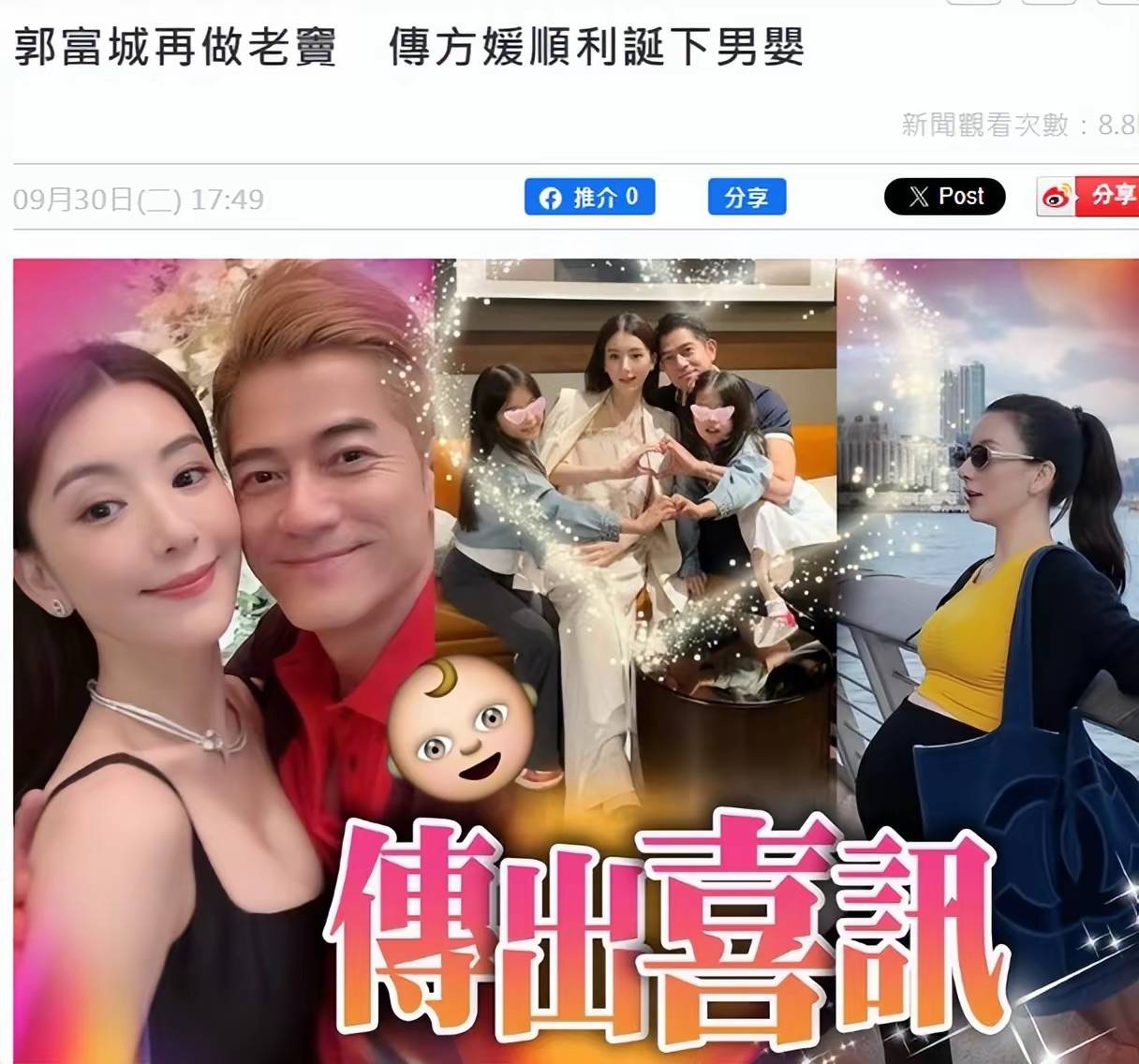 2025年9月30日,港媒曝光郭富城方媛迎来第三个孩子,是一名体重6.5斤的男婴。虽然预产期在10月4日左右,但只相差6天、孩子也已经足月了。