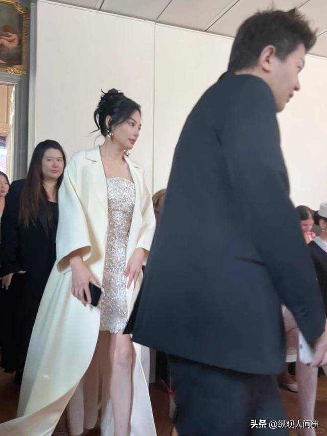 穿着一身白色礼服,里面闪亮的裹胸裙,外面披着一件白色大衣,光是坐在位子上,就自带氛围感。