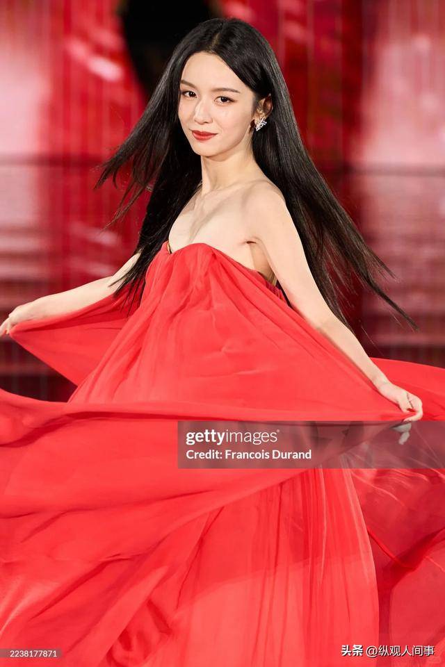 她穿着一身红色裹胸长裙,看着裙子布料很素,设计也平平无奇。