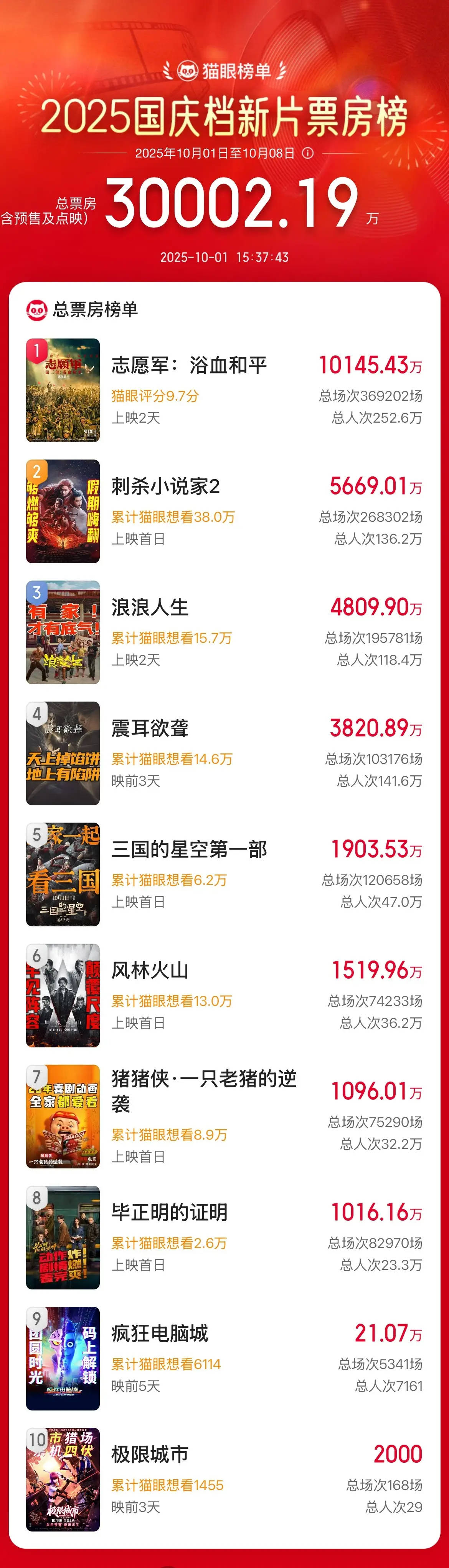 据猫眼专业版数据,截至10月1日15时37分,2025国庆档新片总票房突破3亿!其中,《志愿军:浴血和平》《刺杀小说家2》《浪浪人生》分列前三位。此外,截至10月1日17时2分,电影《志愿军: