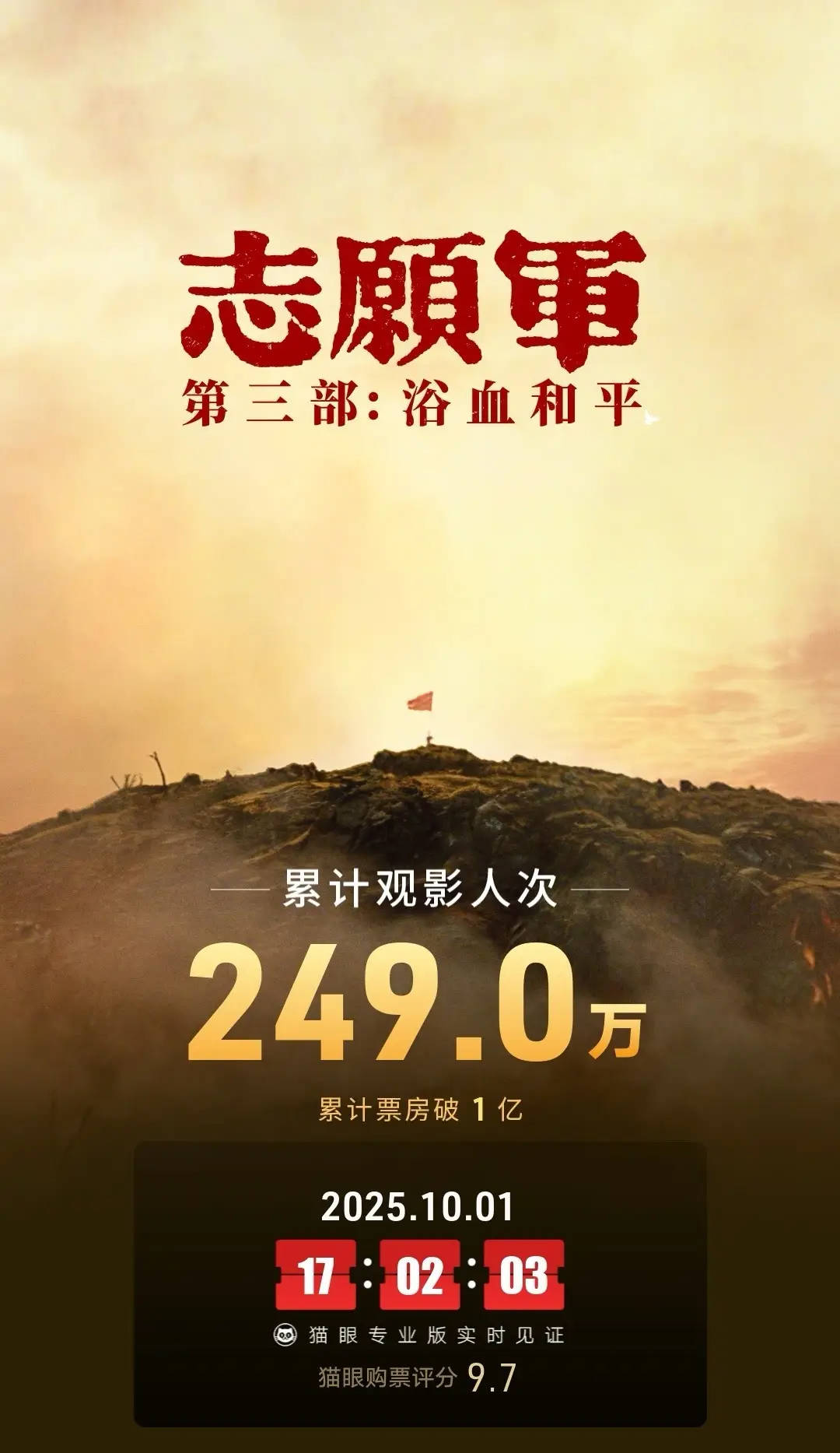 此外,截至10月1日17时2分,电影《志愿军:浴血和平》上映2天 ,总票房破亿,成为国庆档新片首部破亿电影。