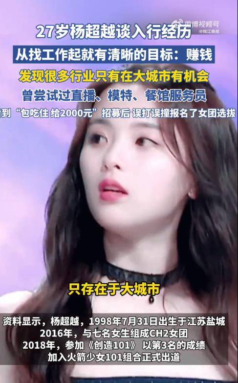 彼时的杨超越还是个为生计发愁的普通女孩。她敏锐地察觉到,真正能改变命运的机会往往只向大城市聚集。在无数行业门槛前徘徊时,一则“包吃包住月薪2000元”的招募信息成为命运转折点,这并非精心策划的明星梦,而是底层打工者最现实的择业逻辑。她坦言当时甚至不了解什么是女团,只是抱着“试试看”的心态报名选拔,却意外踏上了改变人生的偶像之路。