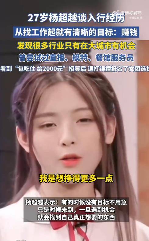 热搜话题“杨超越说从找工作起目标就是赚钱”像一颗投入职场焦虑潮水的石子,激起层层涟漪。27岁的杨超越在近期访谈中剖白入行初衷,没有华丽辞藻,没有艺术梦想,只有
