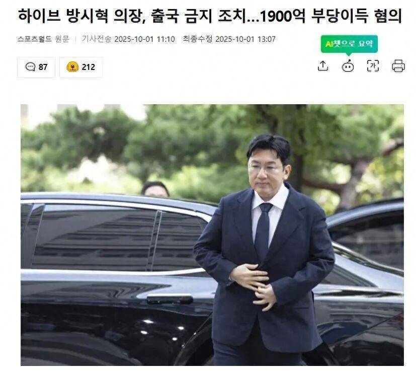 曾经一手将防弹少年团推向全球神坛的HYBE,其董事长房时赫(方时赫)最近却以一种极不光彩的方式成为了焦点——据韩国媒体10月1日报道,他被韩国警方正式下达了出境禁令,原因竟是涉嫌通过一场精心设计的“资本游戏”,非法获利高达1900亿韩元(约合10亿人民币)!