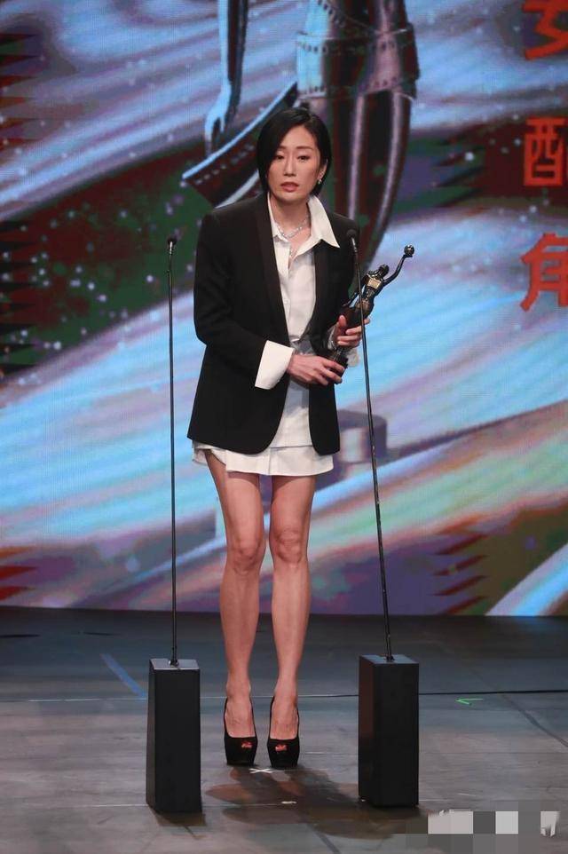 更在第43届香港电影金像奖颁奖典礼凭借《爸爸》获得最佳女配角。当天的她一头清爽短发,身穿黑白配套装,依旧又美又飒。