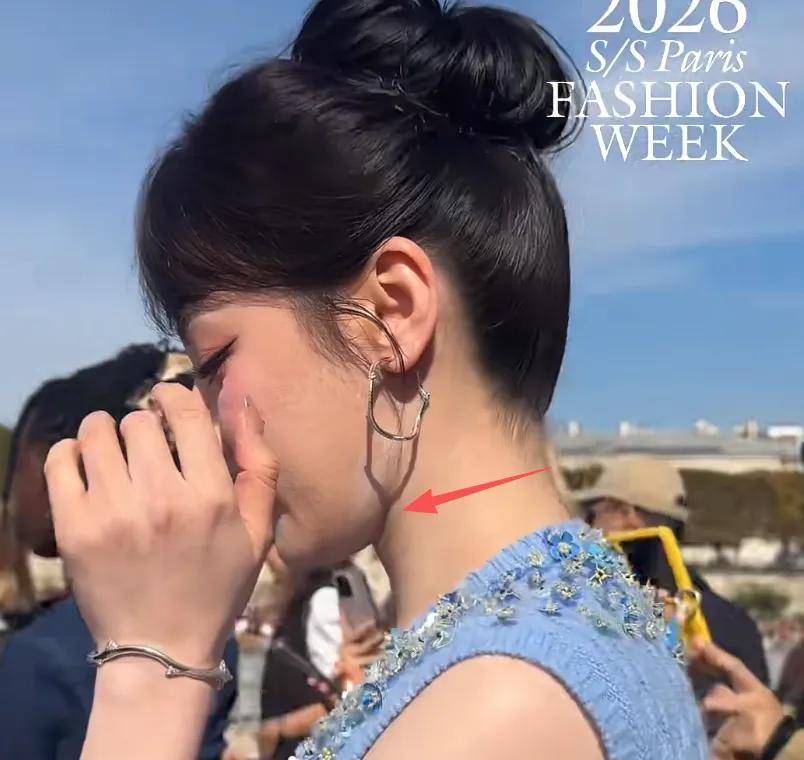妆容也化得不好,不知道是故意画黑了,还是打得阴影,下颌线衔接处非常不自然,从侧面看分层很明显。