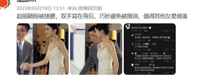 还有网友翻出赵丽颖之前对待搂腰咸猪手的做法,直接双手背到身后,巧妙挡住了对方的手,这似乎才是一线明星应对搂腰的态度。