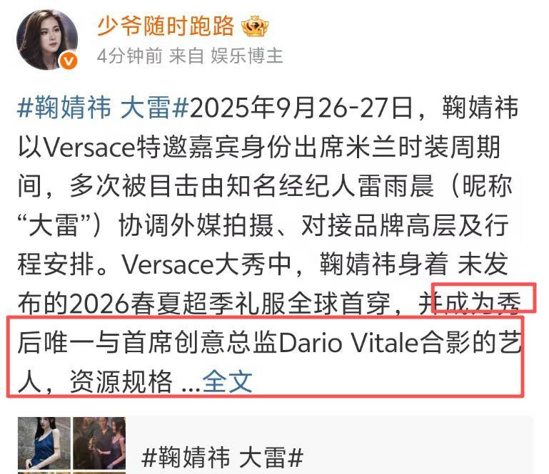 外网发了一张她和达里奥的合影,她也是唯一一个跟达里奥在大秀后合影的艺人,咖位是足够高了,也验证她的时尚资源真是上了个台阶。