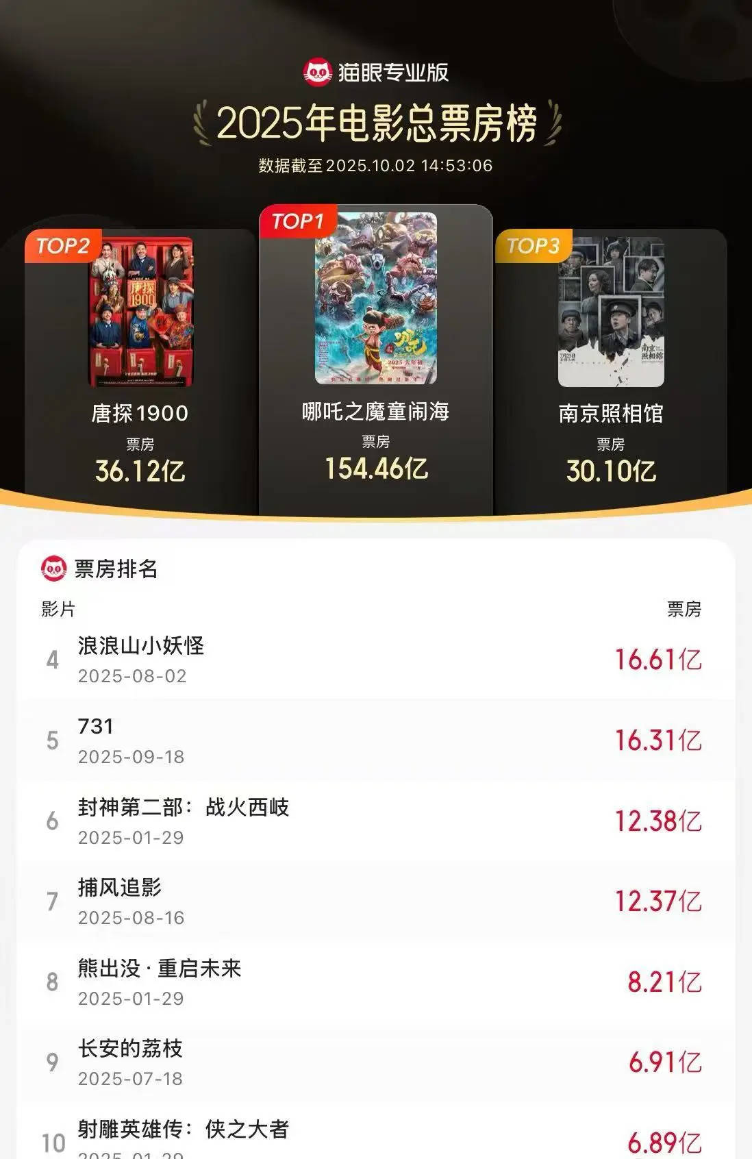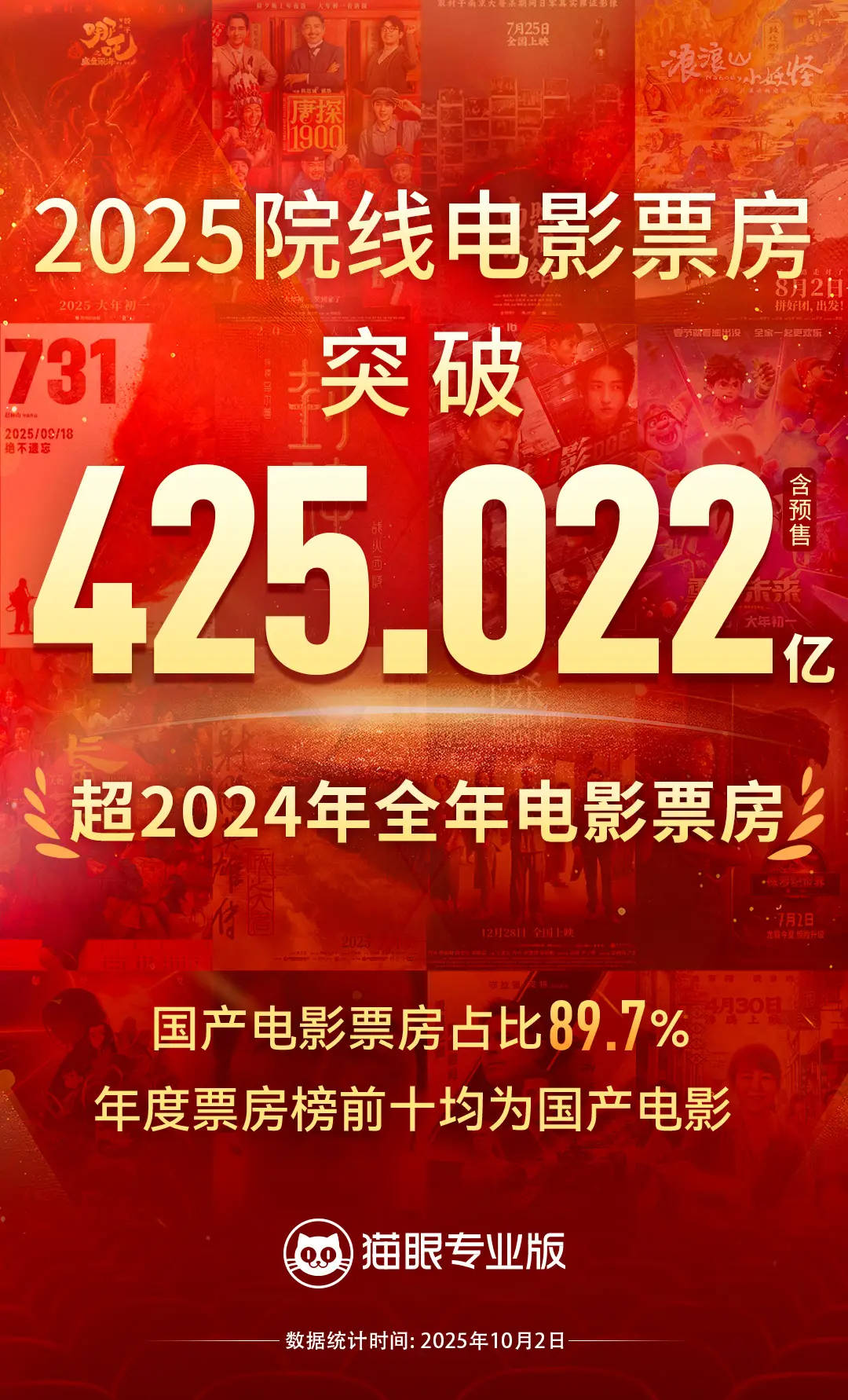 据猫眼专业版数据,截至2025年10月2日14时16分,2025年度总票房(含预售)突破425.022亿,超2024年全年电影票房成绩!其中,国产电影票房占比89.7%,年度票房榜前十均为国产电影!