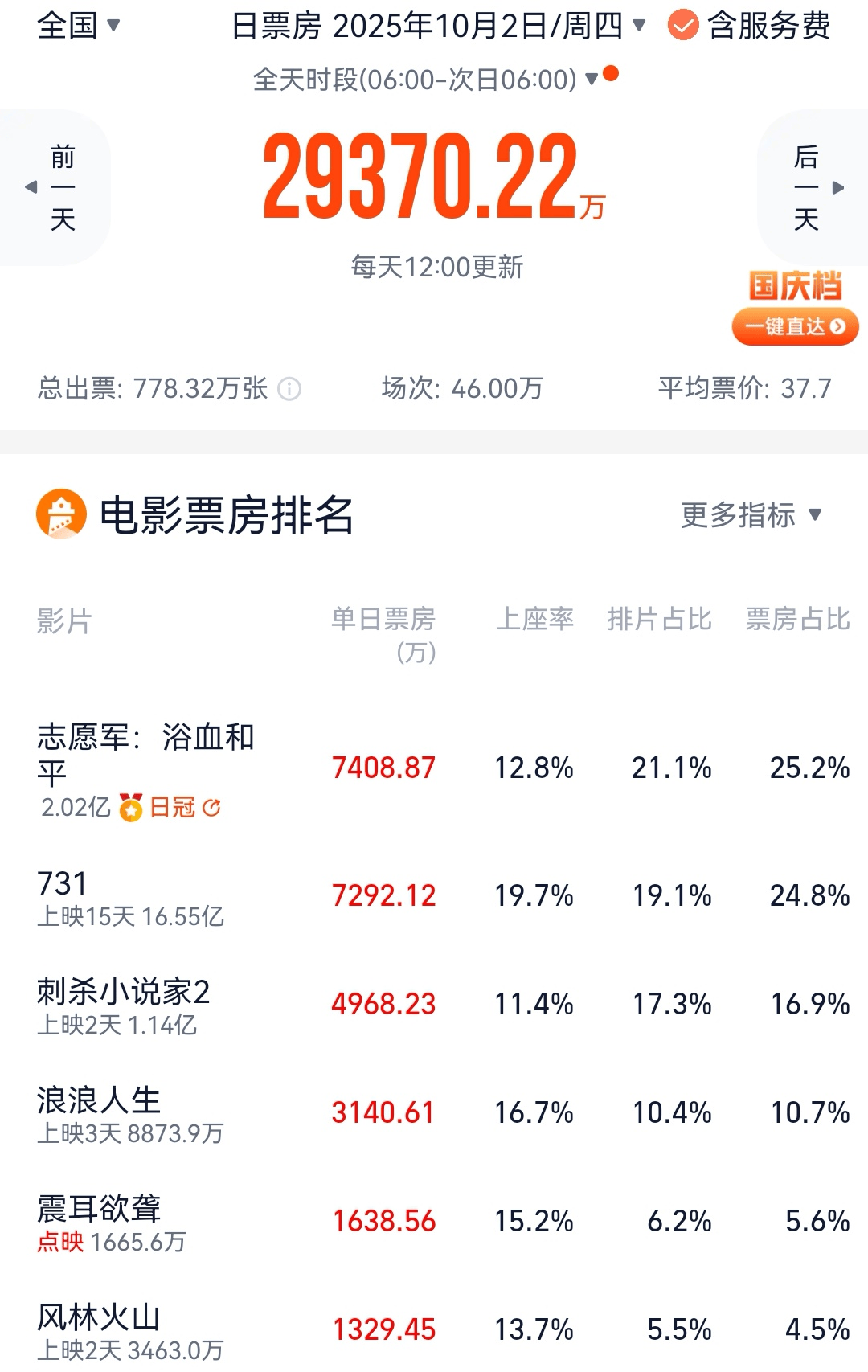 10月2日,《731》排片大涨到19.7%,当日票房近7300万元,远远超过《刺杀小说家2》,差点追近《志愿军:浴血和平》,排在日榜第二。上座率19.7%,仍远高过《志愿军:浴血和平》《刺杀小说家2》《浪浪人生》《风林火山》等新片。