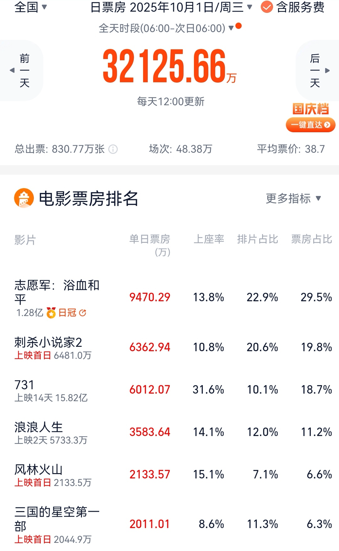 10月1日,《731》以10.1%的排片拿到6000多万元的票房,仅次于《志愿军:浴血和平》和《刺杀小说家2》,排在日票房榜第三,上座率31.6%,是《志愿军:浴血和平》的两倍多,是《刺杀小说家2》的近三倍,遥遥领先。
