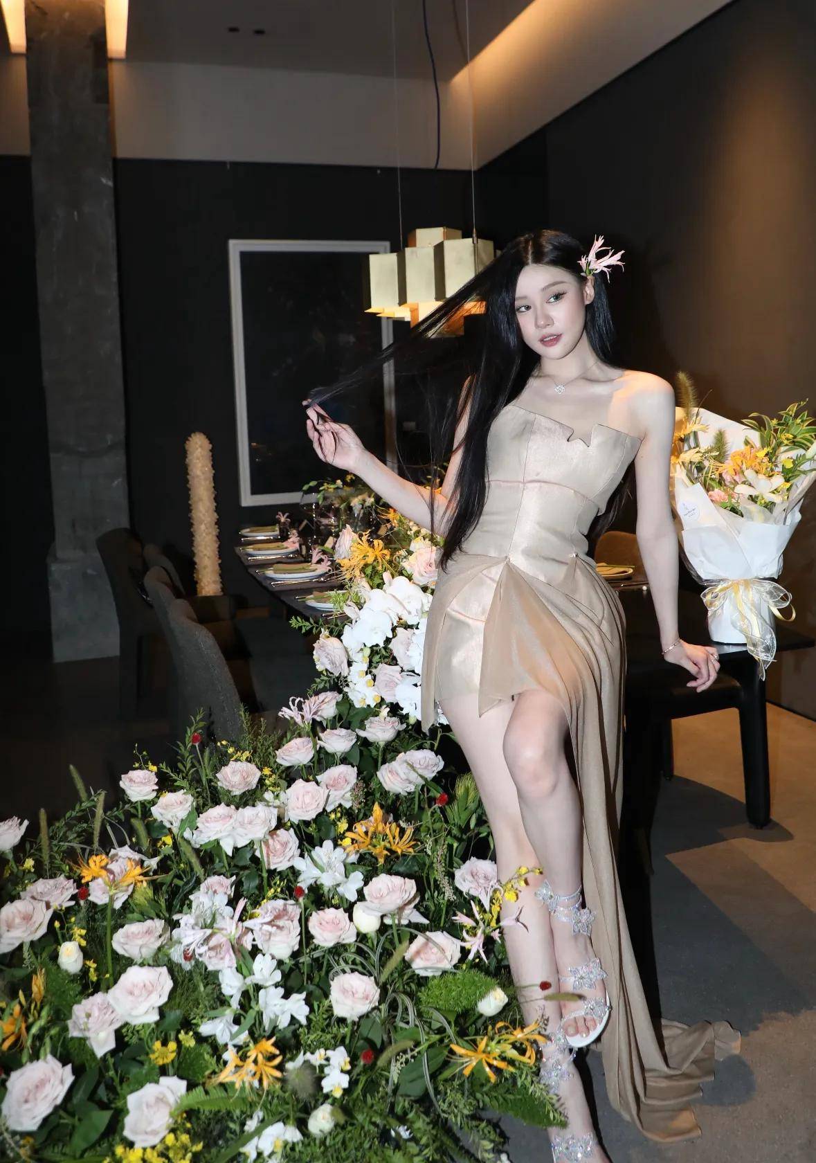 照片里,范斯晶打扮得又美又辣,坐在精心布置的花丛里,氛围感直接拉满,能看出来,为了这个生日,她没少花心思,包厢的布置既漂亮又有格调,她本就身姿高挑,一袭抹胸礼裙加身,修长美腿尤为惹眼,这般绝佳身材,完美承袭了爸爸范志毅的运动禀赋,还有空姐妈妈的出众美貌,着实令人艳羡。