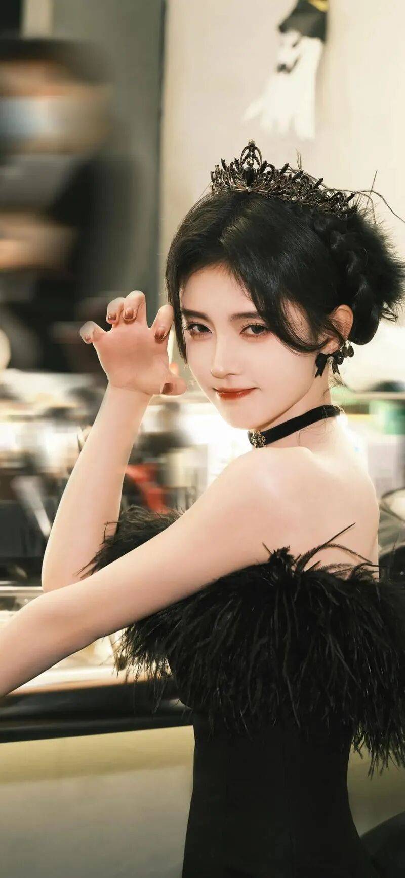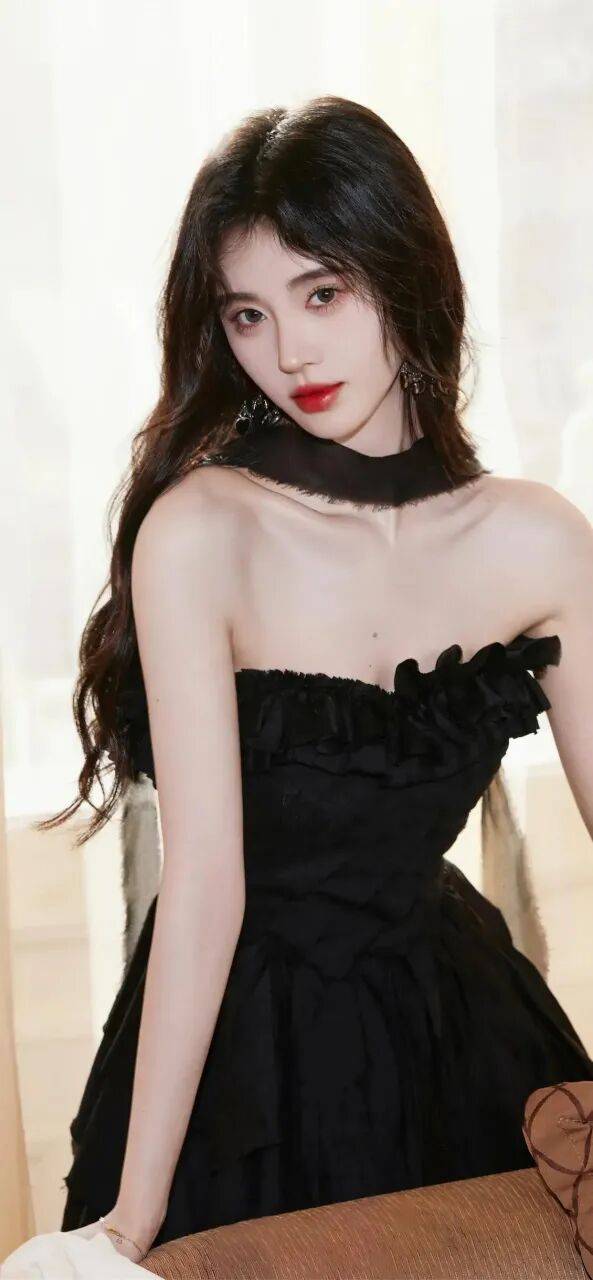 就像这张中,她穿着黑色抹胸吊带裙,单手抚摸黑色长发,露出傲人的事业线,依旧性感火辣!
