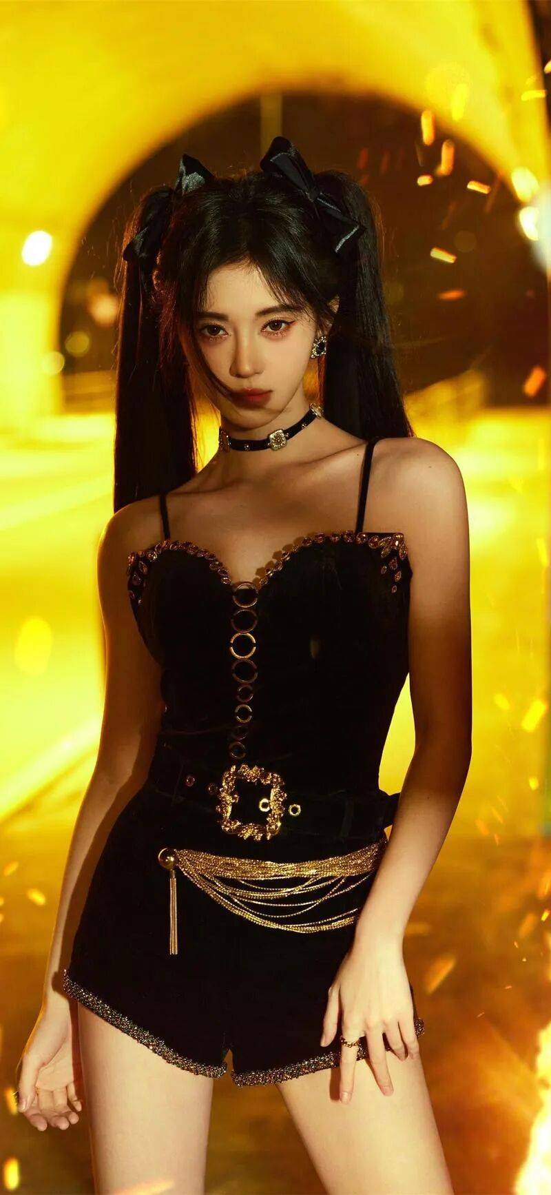 鞠婧祎穿着黑色衣裤,她长发梳成马尾巴,蹲在地上的样子很妩媚,露出白皙的香肩和傲人的大美腿,再加上黄色的灯光照耀,绝对性感火辣!