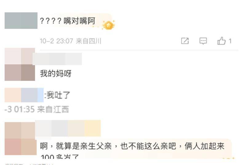 对于两个大男人做出如此亲密的行为,许多网友表示难以接受,纷纷留言吐槽:“我的妈呀!”“就算是亲生父亲也不能这么亲吧”“我吐了” 等,字里行间满是不适感。