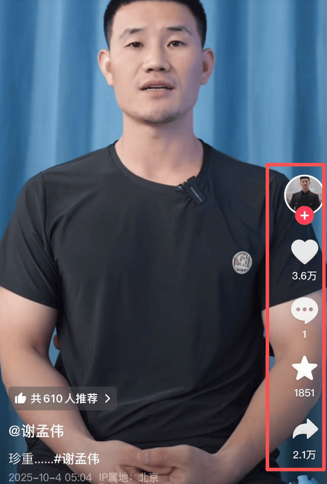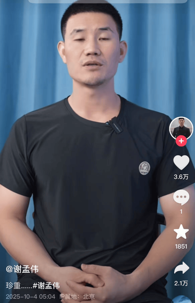 10月4日,“嘎子”谢孟伟账号解封,在清晨5点,他更新了登台,发布了一则视频和一条简短的文案:珍重。谢孟伟在视频中穿着黑衣黑裤,坐得很端正,双手叠放在大腿上,语气低缓地