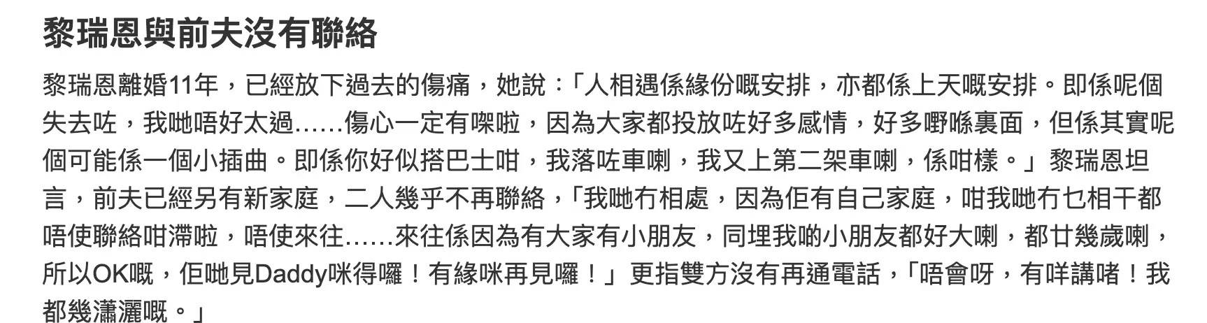 在这段采访中黎瑞恩也表示前夫已经有了新欢,组建了新的家庭。言外之意就是自己更没必要打扰了,所以不联系、不见面就是最好的处理方式。