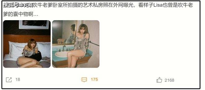 除了比伯之外,女星Lisa也被质疑卷入风波。有博主晒出疑似Lisa在吹牛老爹卧室拍摄的私房照,质疑两人私下关系匪浅。但这则艺术照其实是Lisa自己在外网发布的正常宣传照,根本不是在吹牛老爹房间拍摄的,一些亲密合影也都是P图。