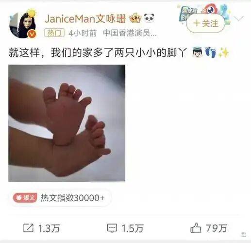 2025年9月30日文咏珊低调官宣生子后,“文咏珊孩子 手握顶级人生剧本”上了热搜,毕竟文咏珊与丈夫吴启楠的孩子被网友称为“手握顶级人生剧本”。