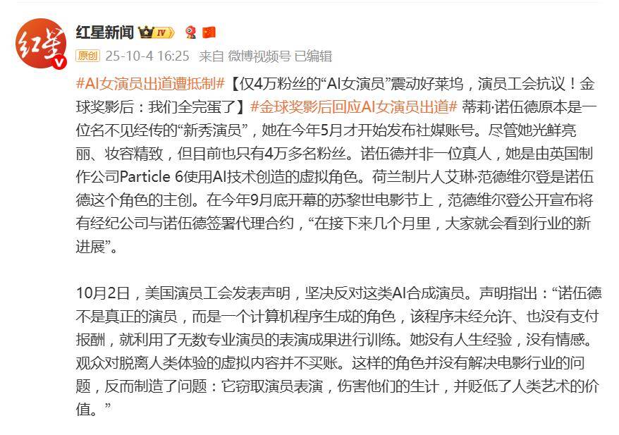 2025年9月,荷兰制片人艾琳·范德维尔登在苏黎世电影节高调宣布,诺伍德将签约经纪公司,并宣称其能“降低制作成本90%”。这一言论瞬间触发美国演员工会(SAG-AFTRA)的强烈抗议。工会在10月2日发表严正声明,指出诺伍德是“计算机程序生成的角色”,其训练数据来自“未经许可、未付费”的真实演员表演成果,缺乏人生经验与情感,不仅挤压真人演员生存空间,更违反2023年好莱坞罢工达成的AI使用协议。