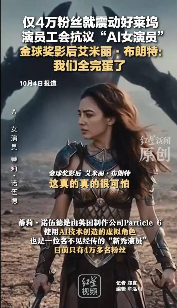 当一位“20多岁英国棕发女性”蒂莉·诺伍德以AI合成演员的身份签约经纪公司,并宣称要成为“永不疲倦的文化偶像”时,好莱坞的怒火被彻底点燃了。这场由技术掀起的风暴,不仅让观众直呼“瘆人”,更让金球奖影后艾米丽·布朗特在播客中惊呼:“完了,我们真的全完蛋了!”