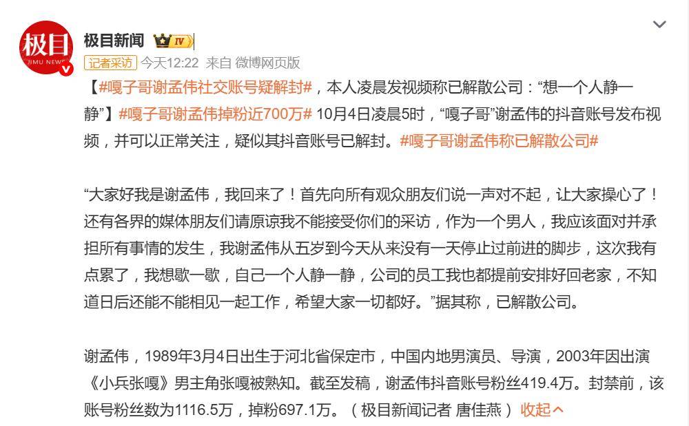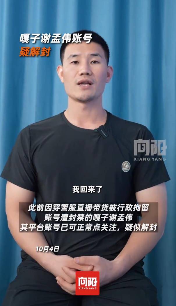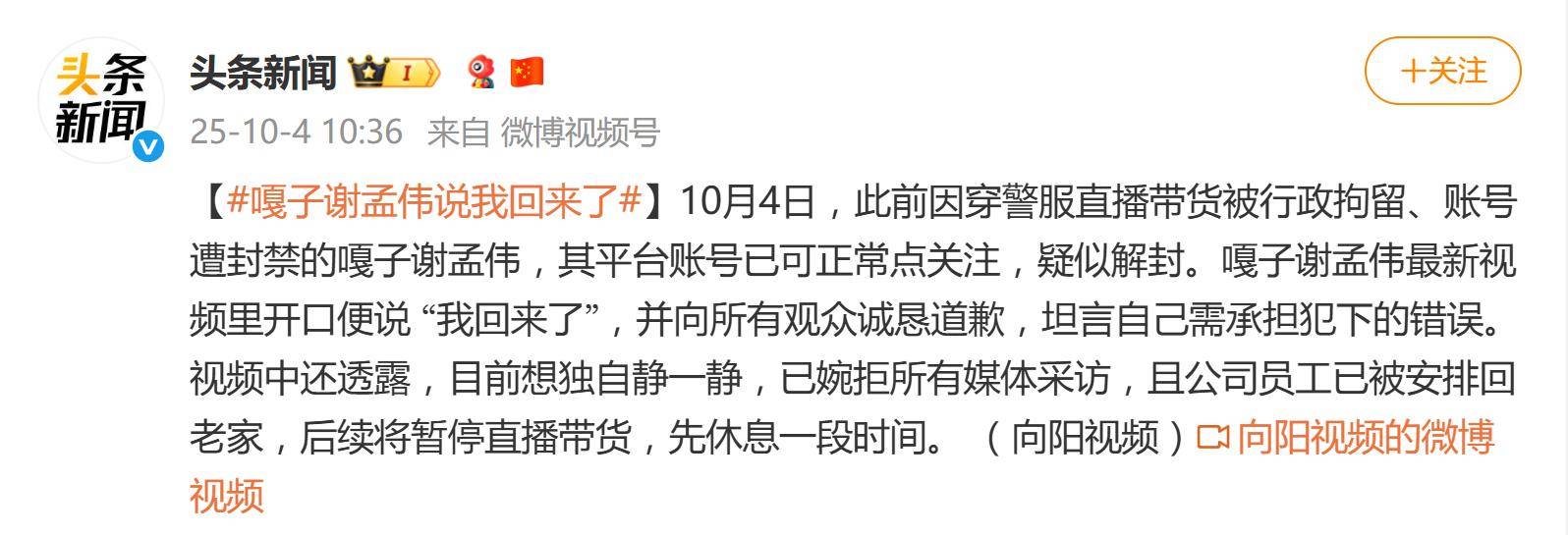 10月4日凌晨5点,“嘎子哥”谢孟伟的抖音账号疑似突然解封,一条“我回来了”的短视频瞬间引爆网络。视频里他开口先道歉,坦言“该承担所有事情&rdquo