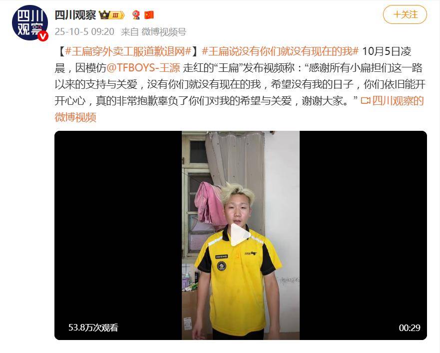 回顾王扁的“退场前奏”,可谓戏码十足。9月24日,他曾高调宣布“暂停模仿王源,回归外卖工作”,当时就被质疑是为规避侵权风险的缓兵之计。要知道,那会儿他的账号在30天内疯狂涨粉超过19万,一条视频报价高达20至40元,正是流量变现的黄金期。