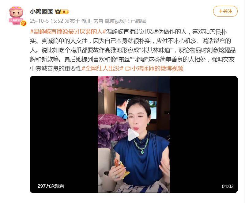 直播中,温峥嵘毫不留情地批判两类行为:一是硬把普通鸡爪包装成“米其林味道”的矫情形容,二是聊天时刻意强调奢侈品品牌、新款,甚至通过贬低他人物品来秀优越的操作。她直言这类虚伪做派“消耗精力”,自己性格朴实直接,“应付不来心机多、说话绕弯的人”。相反,她偏爱与善良朴实、真诚简单的人交往,更点名欣赏赵露思(露丝)和陈都灵(嘟嘟)这类艺人。