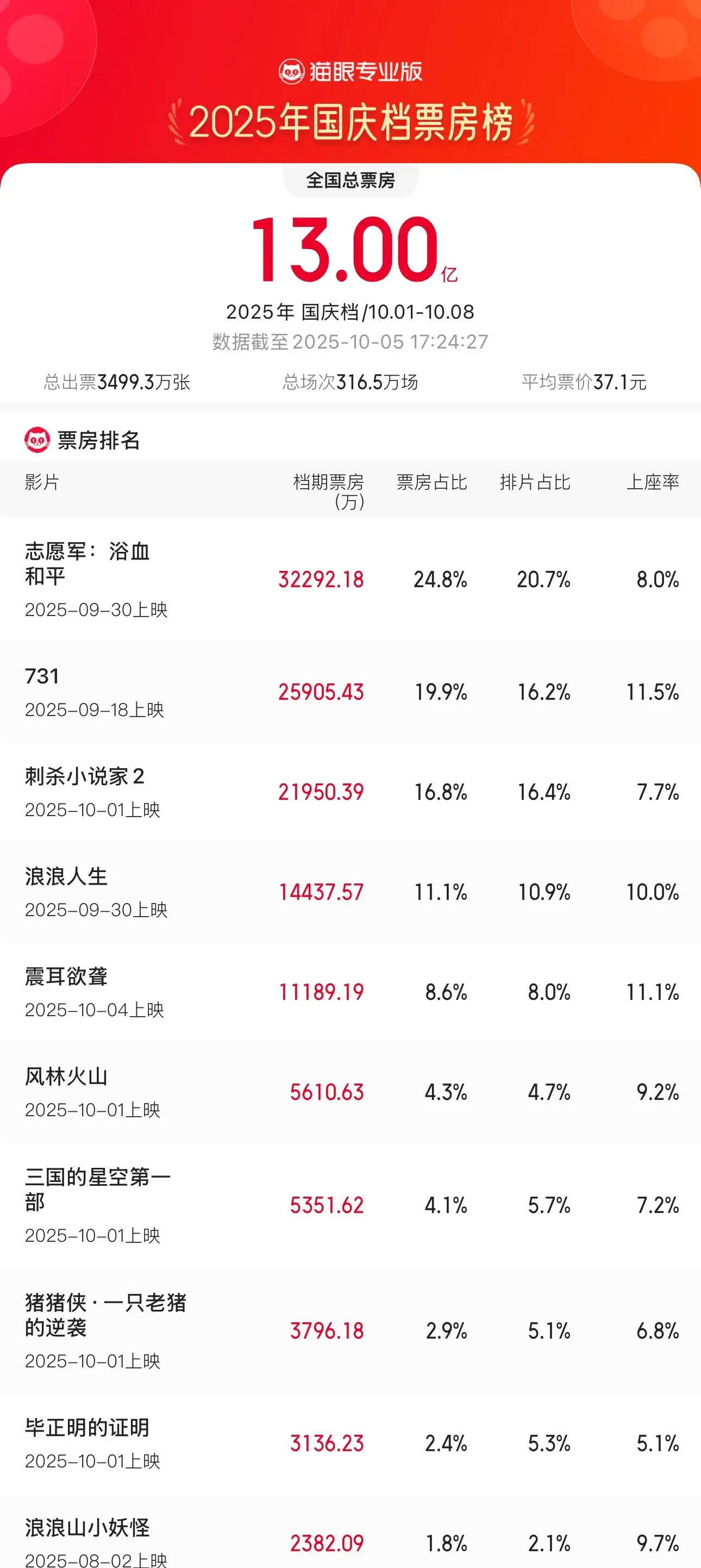 据猫眼专业版数据,截至10月5日17时23分,2025年国庆档档期票房破13亿,《志愿军:浴血和平》《731》《刺杀小说家2》分列前三位。