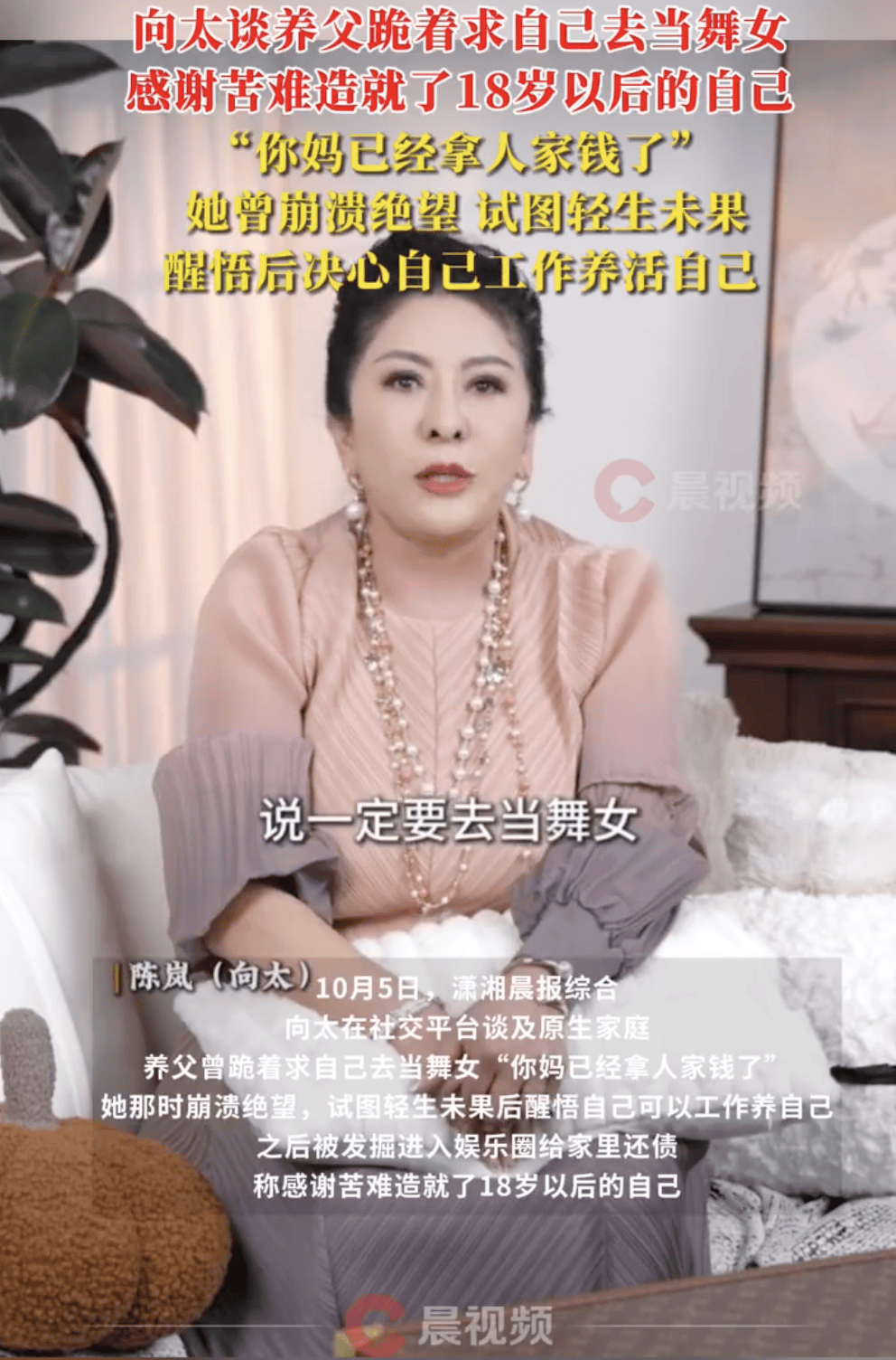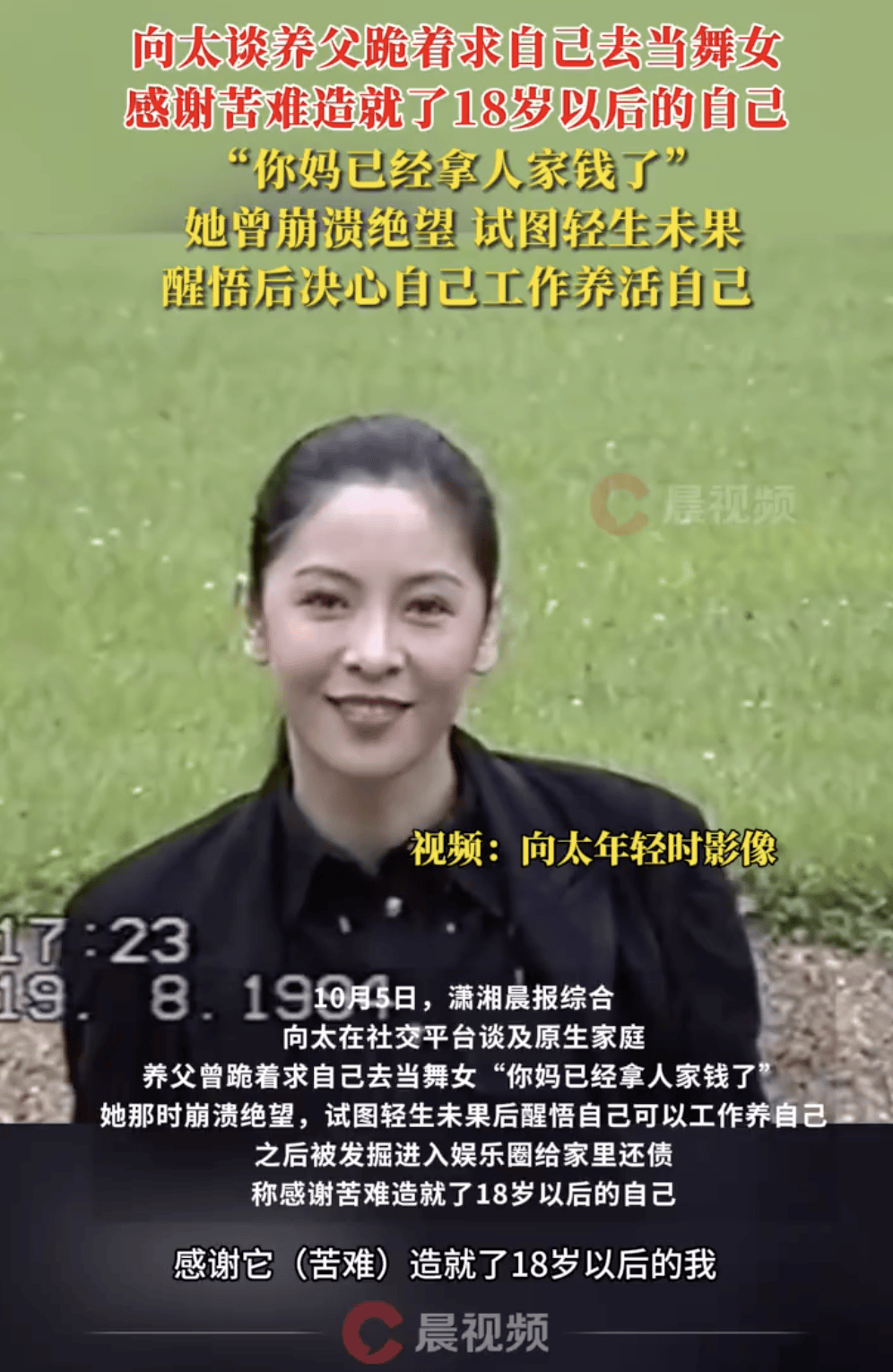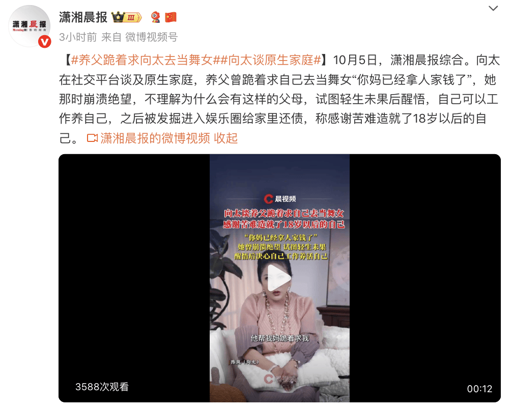 (来源:潇湘晨报)10月5日,潇湘晨报综合。向太在社交平台谈及原生家庭,养父曾跪着求自己去当舞女“你妈已经拿人家钱了”,她那时崩溃绝望,不理解为什么会有这样的父母,试图