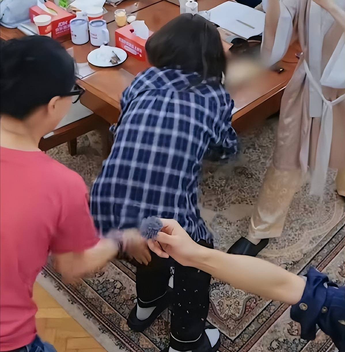 团队合影环节,马思纯为找位置坐下,不慎侧身压到桌子边缘,因重心失衡导致整张桌子翻倒,物品散落一地。