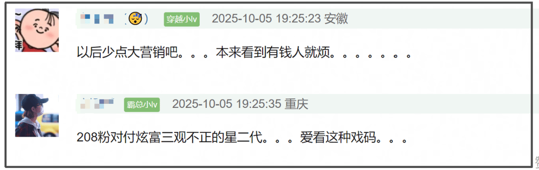 但是,大部分网友还是比较旁观者心态,认为资源咖小花和星二代的矛盾半斤八两,不必计较谁对错,认真看戏就好。李湘常年带着王诗龄参加名媛活动被质疑炫富三观不正,而周也出道起就被冠以资源咖,还曾因小牌大耍翻车,两方给人的观感都相对一般,所以大众喜闻乐见两方打起来,期待更热闹一点。