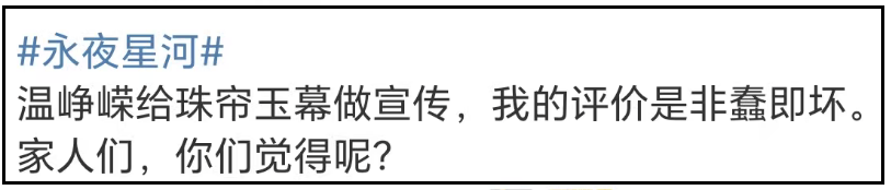 她的这个行为,当时也引发很多讨论。有虞书欣粉丝内涵:“我们只有剧粉了。”还有人直接批评温峥嵘情商太低,拎不清,自己的剧还在播,却给对家宣传,有抱团的嫌疑。