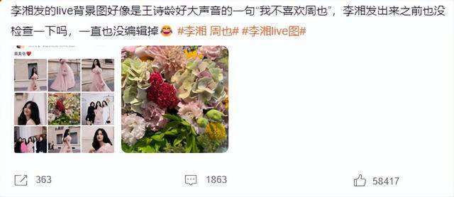 据网友爆料,李湘在晒出的巴黎时装周照片中,第五张Live照片中,有人说了一句“我不喜欢周也。”