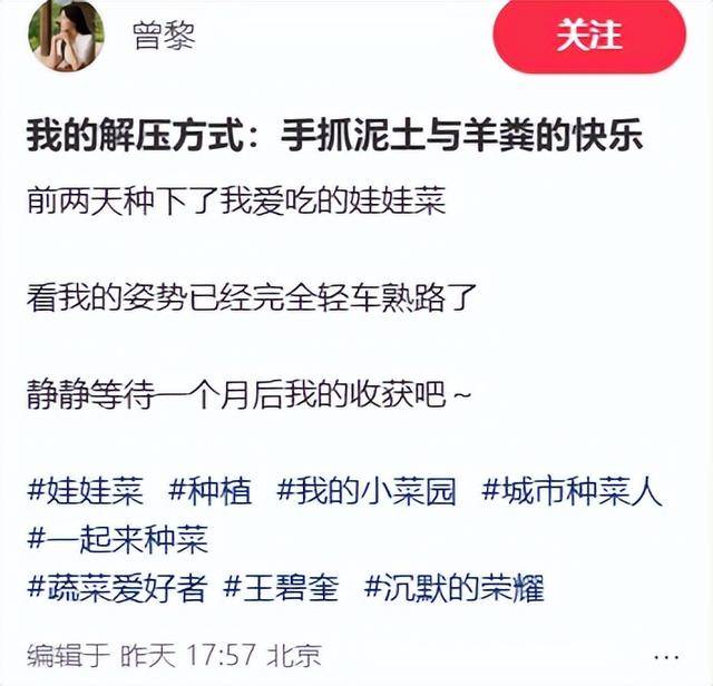 画面中的她看着好真实,其实离开纷纷扰扰的娱乐圈,她闲适的在农村老家种菜也是一种不错的选择。