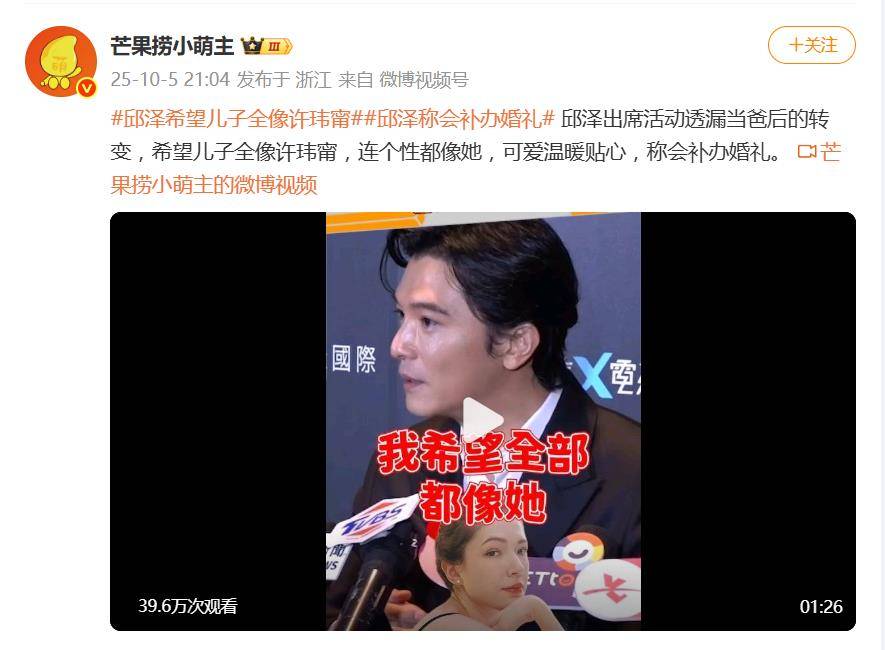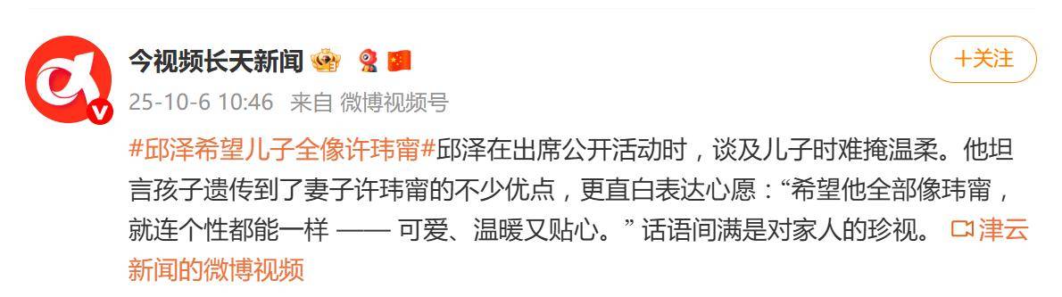 10月6日有媒体报道,邱泽在公开活动中谈起儿子时,语出惊人:“希望他全部像玮甯,连个性都要像她!”这份毫不掩饰的偏爱,瞬间点燃了舆论场。他细数妻子的特质—&mdas